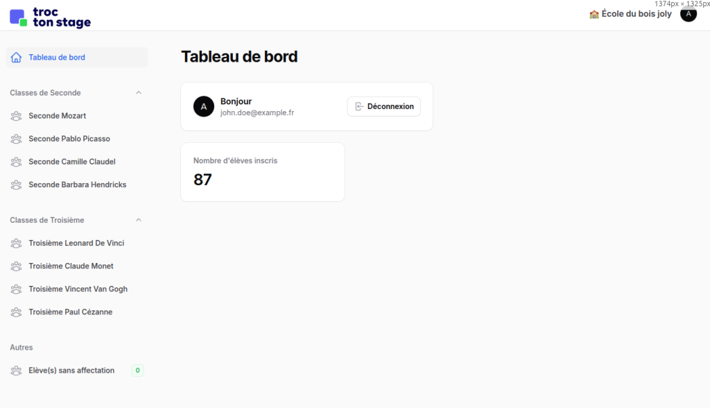 - Intégration Collèges & Lycées : offrez le Premium à tous vos élèves et pilotez les stages avec un back-office dédiéAvec Troc Ton Stage, votre établissement dote chaque famille d’un accès Premium pour trouver un stage pertinent (matching par domaines/métiers/zone) et bénéficie… Lire la suite : Intégration Collèges & Lycées : offrez le Premium à tous vos élèves et pilotez les stages avec un back-office dédié